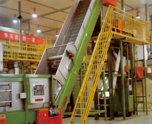 喂料機介紹 喂料機用于煙草制絲生產(chǎn)線中,為不同加工工序輸送物料,是緩沖和物料流量不可缺少的設(shè)備之一。 喂料機可分為:WPL型普通喂料機、WPD型普通喂料機、WC型儲倉式旁鏈喂料機。 結(jié)構(gòu)特點 ●喂料均勻 ●緩沖物料 ●自動調(diào)節(jié)工藝流量、均衡生產(chǎn) 工作原理 工作時,前端設(shè)備將物料送至儲倉,當儲倉頭部的低位光電開關(guān)導(dǎo)通時,提升輸送機開始工作。當物料高度將尾部高料位透射式光電開關(guān)遮住時,前端設(shè)備停止進料。當物料進入提升輸送機入口處,隨著提升帶入口處物料增加,提升帶與儲倉之間的料位光電開關(guān)被物料遮擋,儲倉輸送帶由連續(xù)運行變?yōu)殚g歇運動形成步進。 當機上全部光電開關(guān)再次導(dǎo)通時,表明物料已全部輸送完畢,該機運行30秒以后,所有電機均停止運轉(zhuǎn)。 |