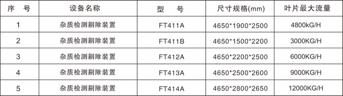 工作原理 FT411~FT414系列雜物檢測(cè)剔除裝置用于煙草工業(yè)的打葉復(fù)烤和制絲生產(chǎn)線的煙葉除雜,該裝置主要由進(jìn)料輸送機(jī)、食品柜、氣流平衡柜、電控系統(tǒng)等四個(gè)主要部件組成。這四個(gè)組件協(xié)調(diào)工作,對(duì)葉片進(jìn)行攤薄,對(duì)其中的雜物進(jìn)行識(shí)別、分揀、剔除。整體用不銹鋼制造,易于清潔、保養(yǎng)。 葉片通過特殊振槽/攤薄機(jī)等輔連設(shè)備,形成均勻薄層,使雜物盡量不夾雜于葉片中間.輸送機(jī)將葉片薄層加速通過特殊振槽/攤薄機(jī)等輔連設(shè)備,形成均勻薄層,使雜物盡量不夾雜于葉片中間.輸送機(jī)將葉片薄層加速通過視頻系統(tǒng),高速線陣CCD相機(jī)拍攝葉片圖像/送入嵌入式FPGA+DSP圖像處理硬件平臺(tái),通過獨(dú)創(chuàng)新一代多維度圖像算法的處理,綜合雜物顏色、形狀、紋理等特征參數(shù),識(shí)別出雜物,并計(jì)算雜物在輸送機(jī)末端的相對(duì)坐標(biāo),進(jìn)而發(fā)出指令,控制相應(yīng)坐標(biāo)的高速氣動(dòng)電磁閥,將雜物剔除。 規(guī)格型號(hào)